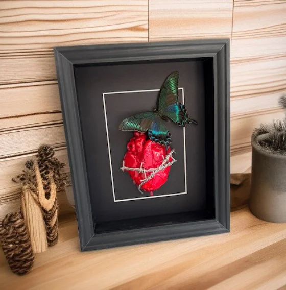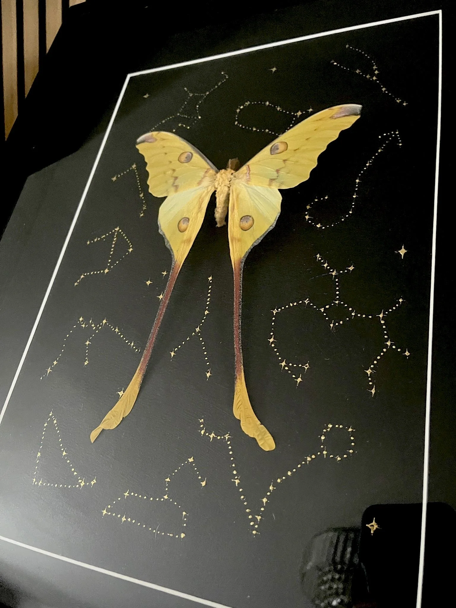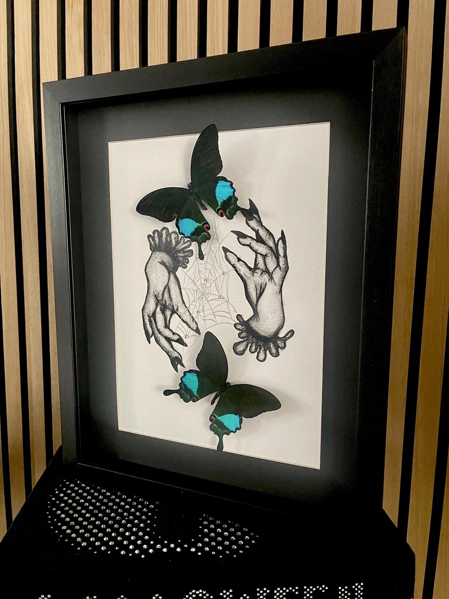 Large Comet Moth Frame with Gold Zodiac Star Signs £110.00 “The Gilded Ritual” – Devil’s Flower Mantis £65.00 Blue Morpho Butterfly Frame £70.00 Tru Vue UV Glass from £8.00 Commissioned Needle Felt £0.00 Sold out Red Glider & Inkcap Mushroom Dome £65.00 Bullseye Moth £50.00 Small Curio Bone Jar Sale Price: £10.00 Original Price: £15.00 Sale Entangled Web Sale Price: £80.00 Original Price: £90.00 Sale Alpine Black Swallowtail £65.00 Papilio Maackii & Heart £60.00